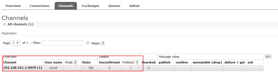 登录RabbitMQ管理界面,有一个channel表示我们已经成功集成rabbitMQ