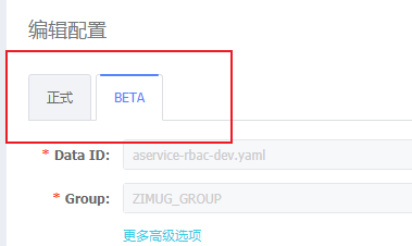 * 配置编辑界面分Tab展示,一个Tab是正式版的配置,也就是192.168.161.5实例正采用的配置。一个Tab是Beta版的配置,也就是192.168.161.3,192.168.161.4实例动态刷新之后的配置。