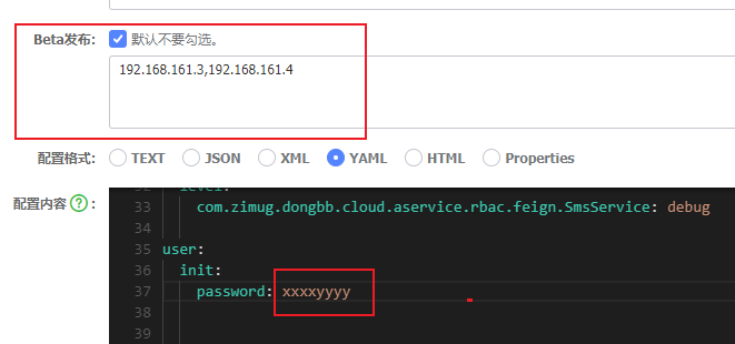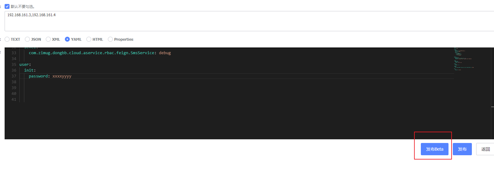 * 在配置编辑界面,修改配置项"user.init.password"的值改为xxxxyyyy。并勾选Beta发布,填写需要Beta发布的微服务实例运行的主机的ip,多个ip用逗号分隔。