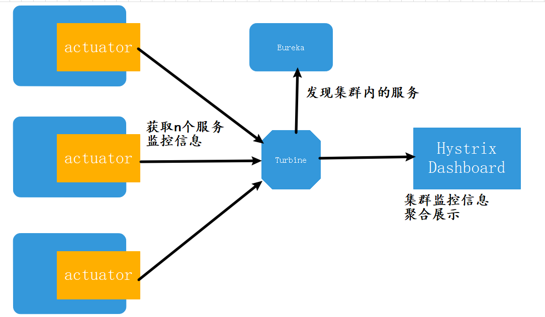 通过上面这张图大家可以看出来,为了达到聚合服务监控信息的效果,我们需要引入一个组件turbine,由它来完成监控信息的聚合工作。