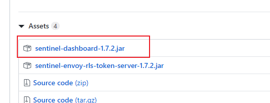我们需要下载并安装的是DashBoard控制台,下载地址:[https://github.com/alibaba/Sentinel/releases](https://github.com/alibaba/Sentinel/releases)。下载如下图所示的`sentinel-dashboard-x.y.z.jar`