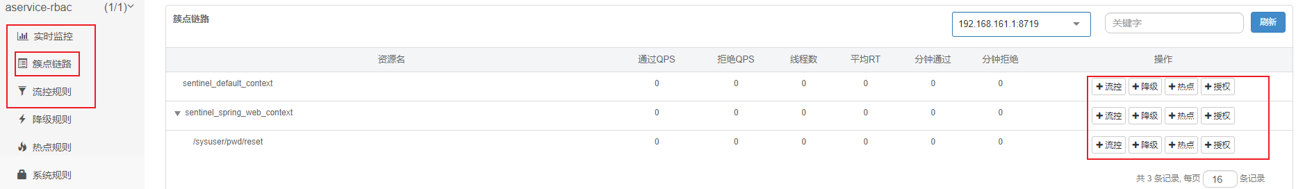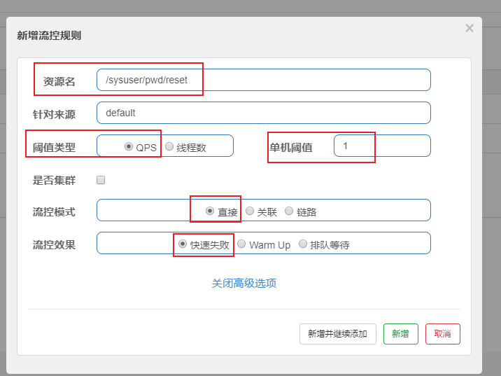 * 资源名称:表示我们针对哪个接口资源进行流控规则配置,如:“/sysuser/pwd/reset”