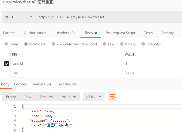使用Postman向“/sysuser/pwd/reset”发送请求,慢点点击发送(一秒一次),返回正常结果: