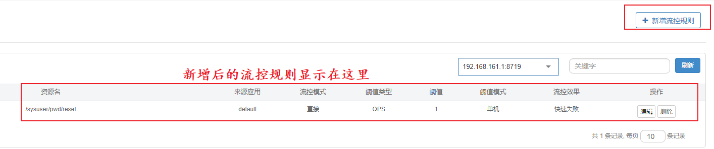 * 在流控规则页面也有“新增流控规则”按钮,添加完成之后的流控规则,出现在流控规则页面列表中。