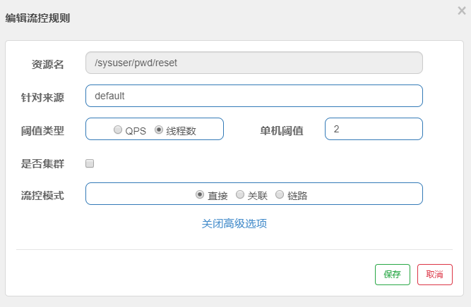 * 资源名称:表示我们针对哪个接口资源进行流控规则配置,如:“/sysuser/pwd/reset”