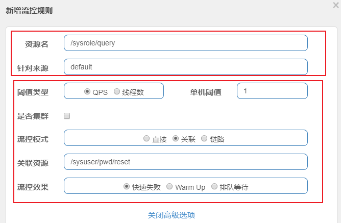 * 当大量的并发请求达到“/sysuser/pwd/reset”关联资源接口的限流标准的时候,“/sysrole/query”资源将被限流。流控效果是快速失败。