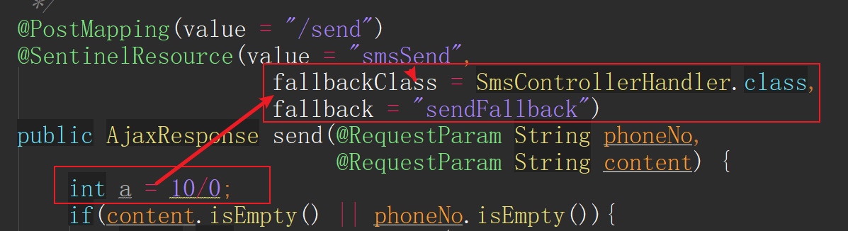 人为制造一个被除数为0的异常,将会执行SmsControllerHandler 类中的sendFallback方法。