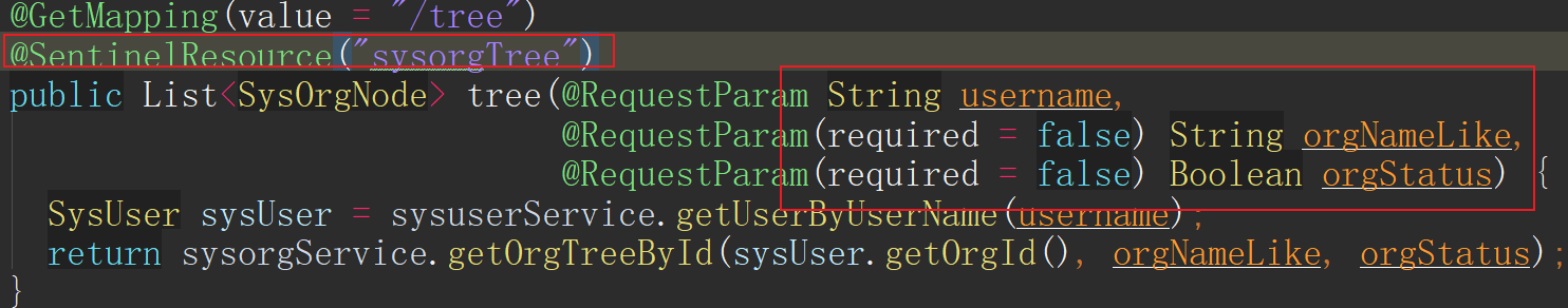 我们的代码内有这样一个接口,我们以它为例为大家讲解热点参数限流。这个接口是一个用户所属组织的树形结构查询接口。