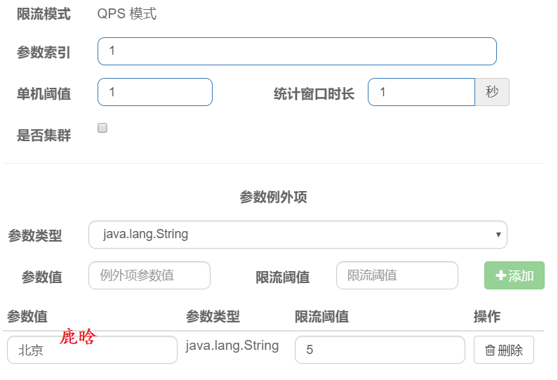 * 但是当参数orgNameLike的值为北京的时候,限流单机阈值是5。