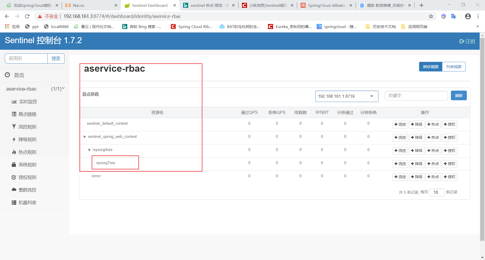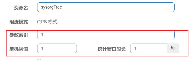 上面的配置的含义是:针对“/sysodg/tree”资源的第二个参数orgNameLike(参数索引从0开始),1秒钟(统计窗口时长)访问超过1次(单机阈值)就进行限流。