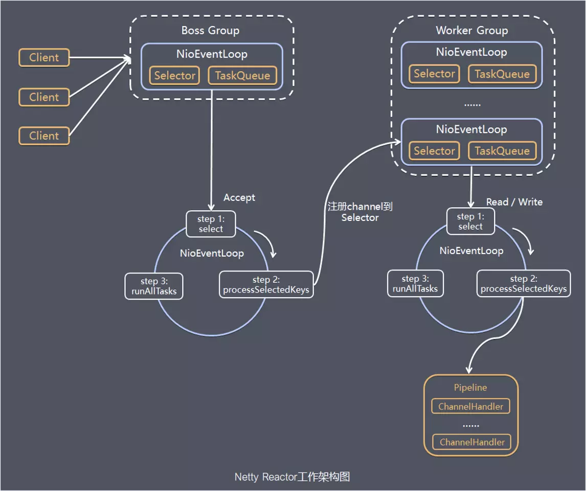 boosGroup用于Accetpt连接建立事件并分发请求, workerGroup用于处理I/O读写事件和业务逻辑