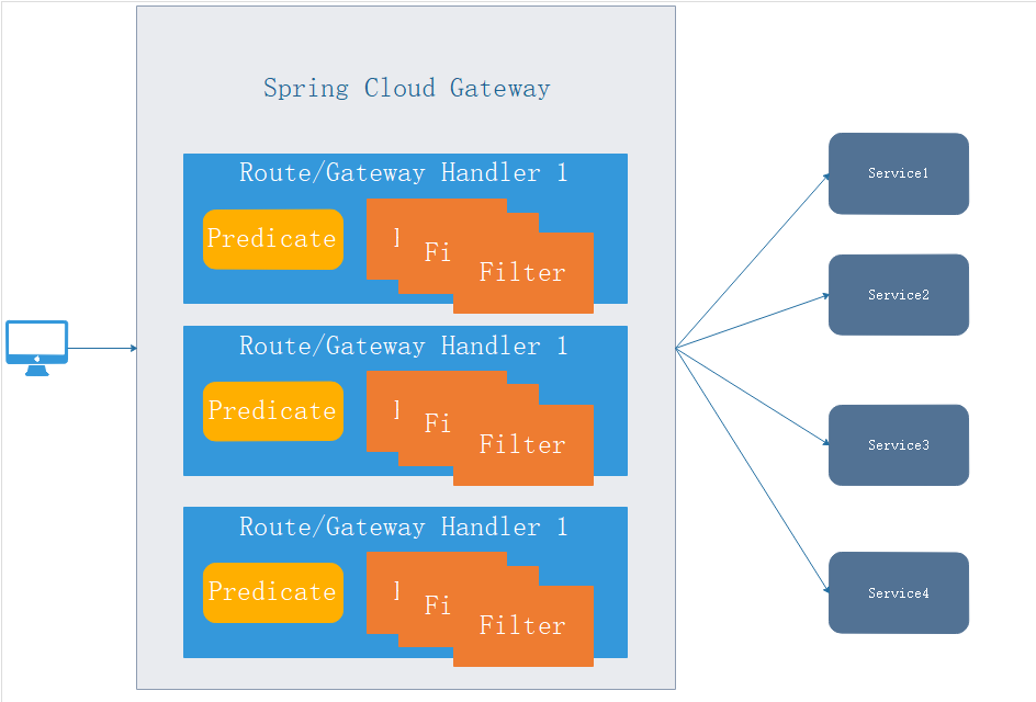 * route(路由):路由实网关的基础元素,由id、目标url、predicate和filter组成。当请求通过网关的时候,由Gateway Handler Mapping通过predicate判断是否与路由匹配,当predicate=true的时候,匹配到对应的路由。