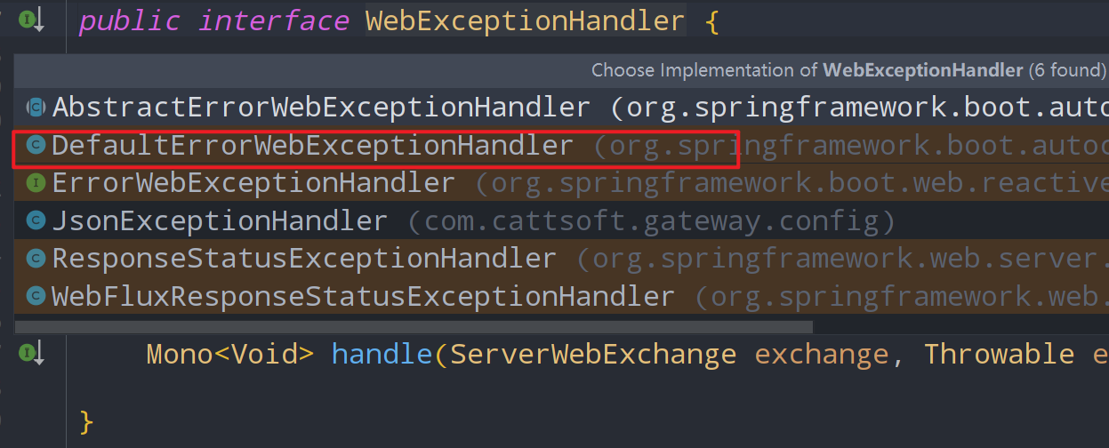 但在实际使用中,我们通常去实现ErrorWebExceptionHandler,ErrorWebExceptionHandler继承自WebExceptionHandler。