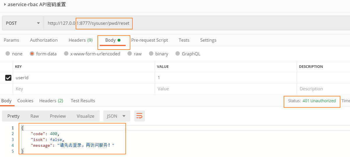 * 将JWT令牌添加到`http://127.0.0.1:8777/sysuser/pwd/reset`访问请求的Header中,再次发起请求