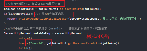 //从JWT中解析出当前用户的身份(userId),并继续执行过滤器链,转发请求