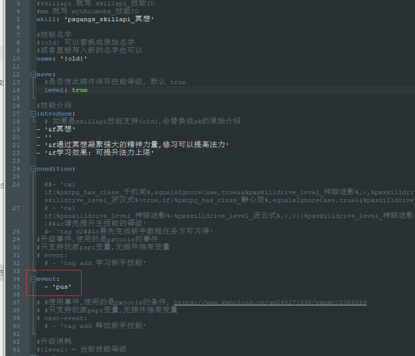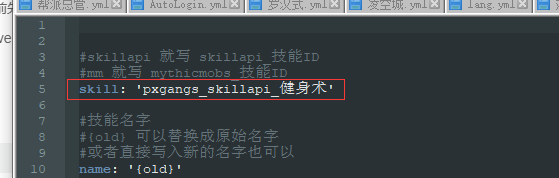 在`PxSkilldrive`插件的配置目录下找到`PxSkillDrive\skilldata\XX.yml`随便一个技能文件打开
