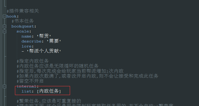 会在玩家每次完成`BookQuest`完成一次该列表内拥有的任务后给帮派当前内政进度`+1`
