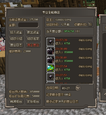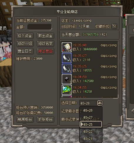 * 玩家创建商会后,出售的物品均有记录日志(永久保存),并且可供玩家自行查询多少天内日志(下列有图片)