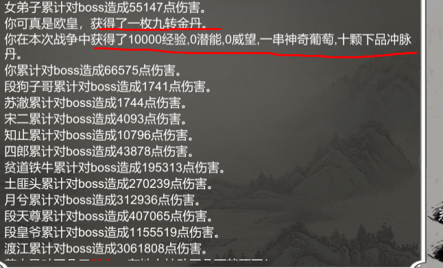 注意!想要获得保底奖励,只需要对敌对BOSS造成至少1点伤害即可!而且副本死亡不惩罚,直接传送武庙,所以,新人朋友不要怕,勇敢大胆上!死了继续进副本!只要摸到1下就可以了!前期九转,冲脉,就靠这个副本了!