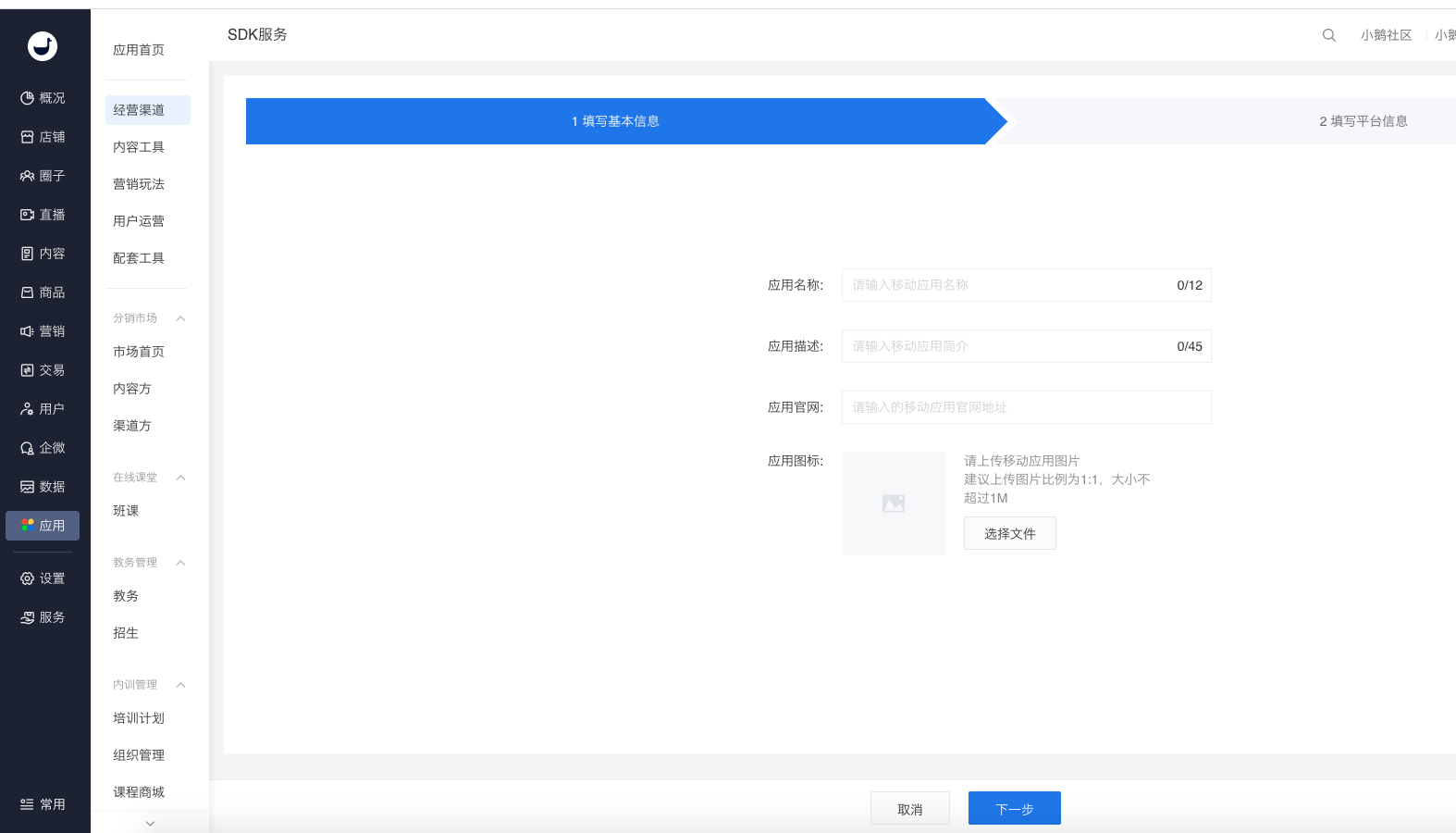 1、因SDK接口权限是在小鹅通后台填写SDK信息后下发的,检查是否在小鹅通后台填写过SDK信息,后期可修改,前期可快速填写跳过(pcweb和h5web接入的商家随意填写iOS&安卓相关信息)