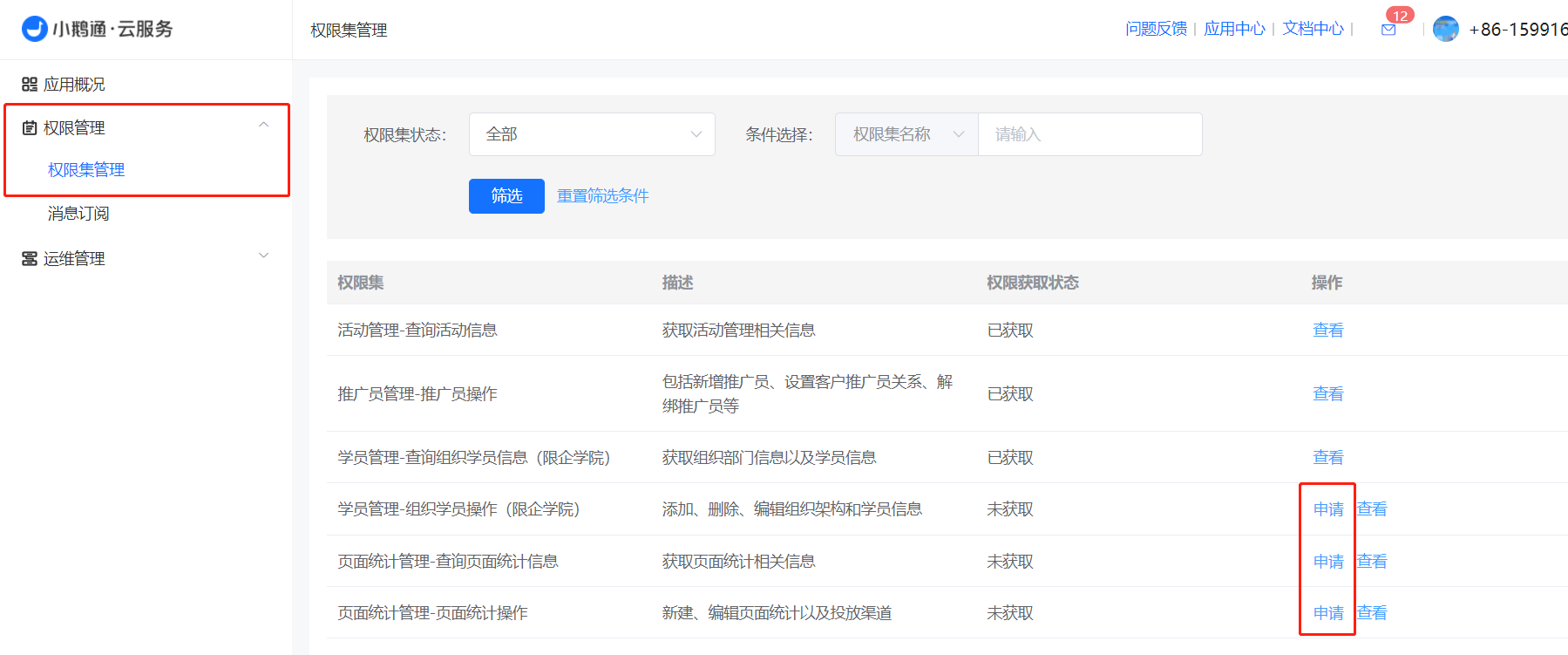 请在小鹅云控制台 **权限管理** -> **权限集管理** 申请对应的API权限,一般工作日2小时会通过,若需紧急通过,请联系服务管家快速审核通过。