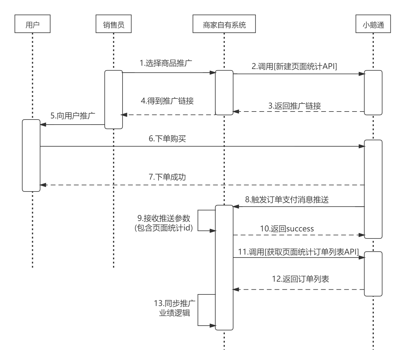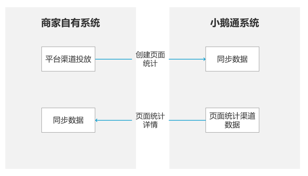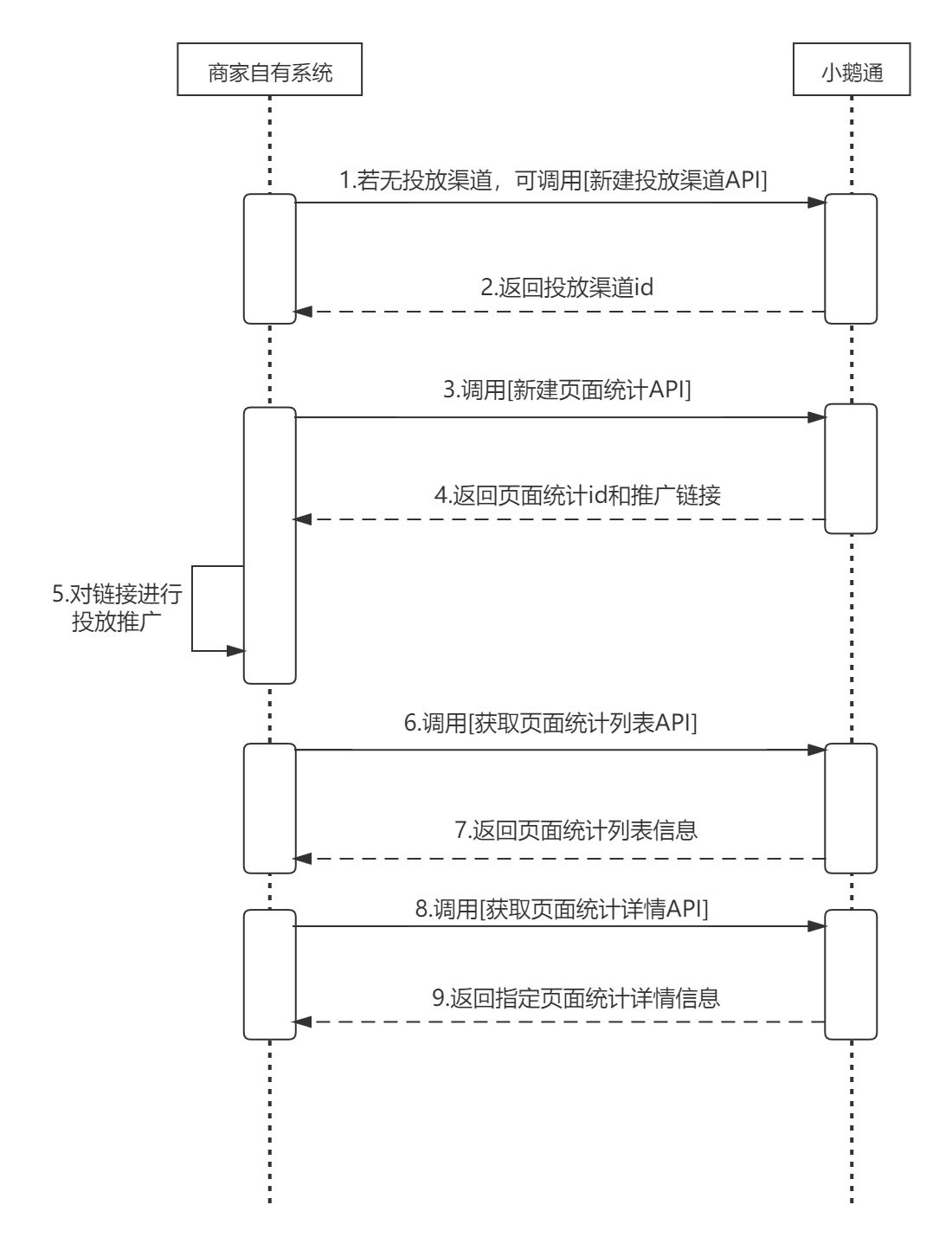 商家在自有系统中有各推广渠道希望同步至小鹅通页面统计中,并获取相关渠道统计数据,用于后续运营中。如:*商家系统有独立的分销体系,通过小鹅通的页面统计功能,能监控不同分销渠道的效果数据以及进行业绩结算。*
