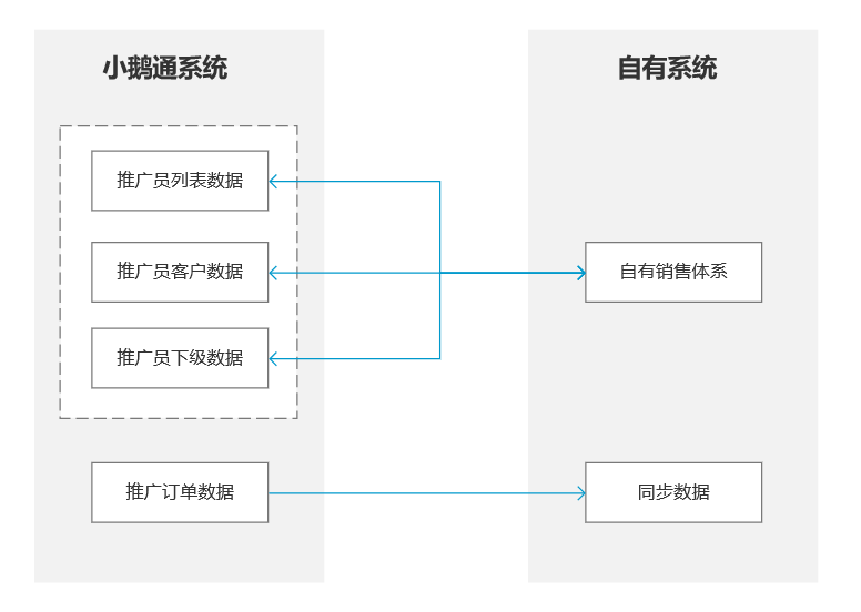 当前支持实现小鹅通系统与商家自有系统的推广员信息双向同步,并且支持商家自有系统同步获取小鹅通系统推广订单数据