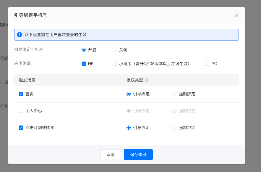 2. H5店铺必须打开强制绑定手机号,因为小鹅通H5店铺是默认微信登录,不强制绑定手机号的,只有打开强制绑定手机号,您的小鹅通所有用户账号都是拥有手机号的,<font color='red'>App这边做账号打通用手机号即可</font>。