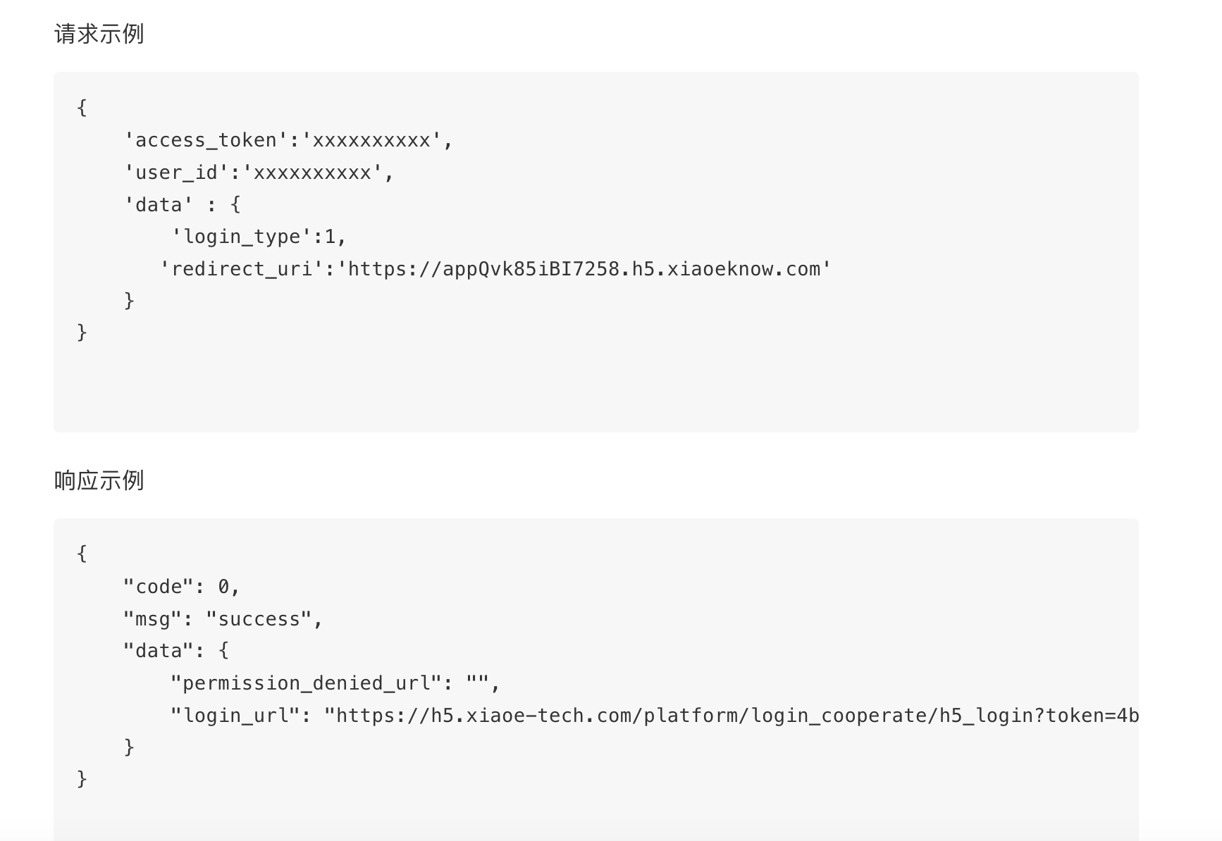 登陆完自有系统的账号后<font color='red'>(此处可做各种商家系统的特殊逻辑)</font> ,可调用[login.url](https://api-doc.xiaoe-tech.com/recall_scene/lnline_sdk/h5_sdk.html)接口获取登录链接,获取登录链接后让客户端<font style='background:yellow'>跳转该链接</font>即可注入登录状态,完成小鹅通的登录。