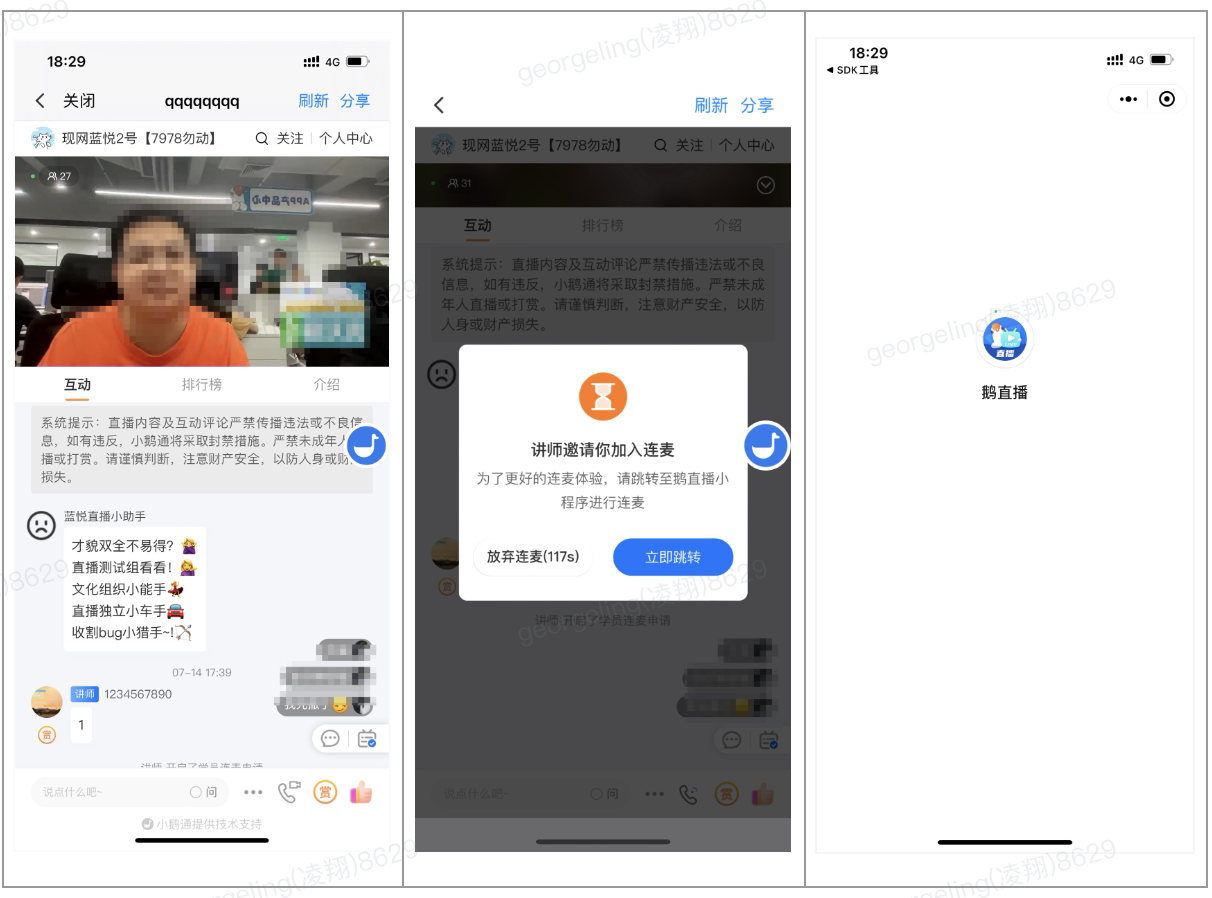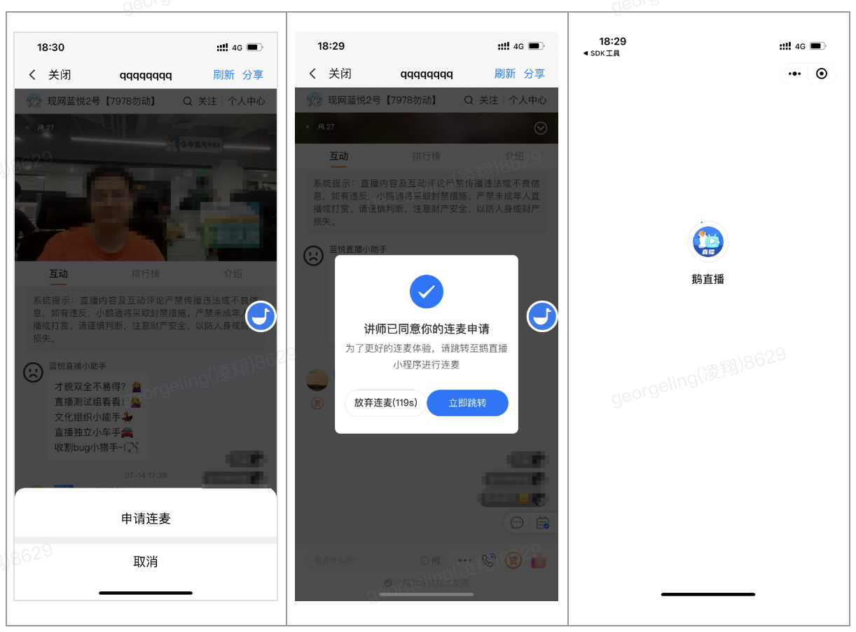 3. 点击立即跳转则拉起鹅直播并进入直播间进行连麦。