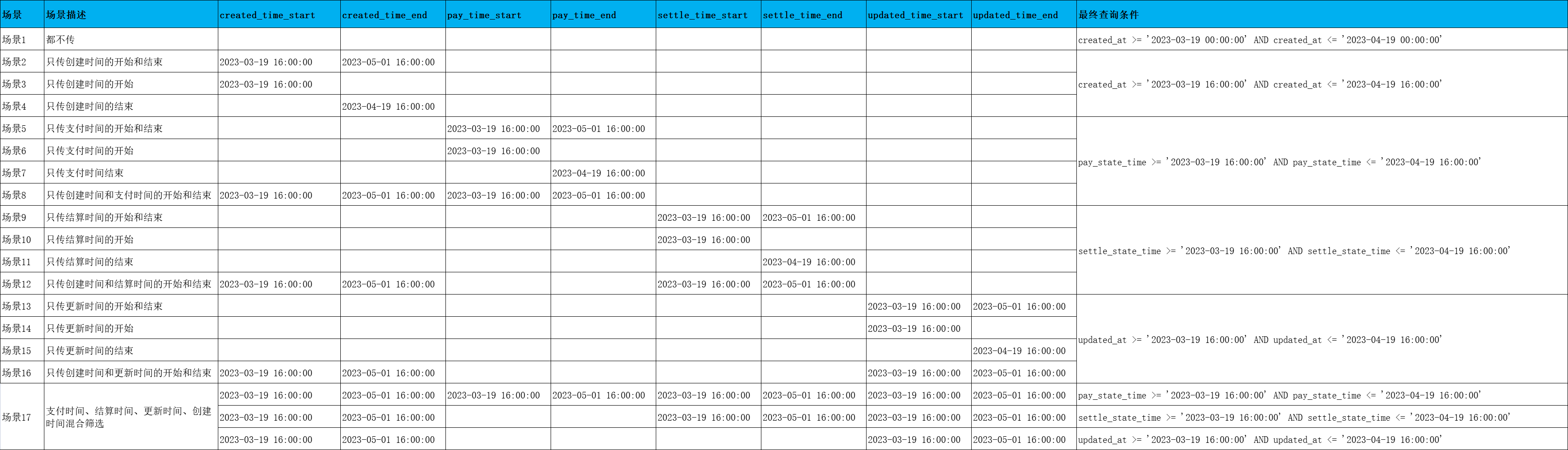 <font color='red'>created_time、settle_time、pay_time、update_time的开始和结束时间差值不能超过31天。</font>