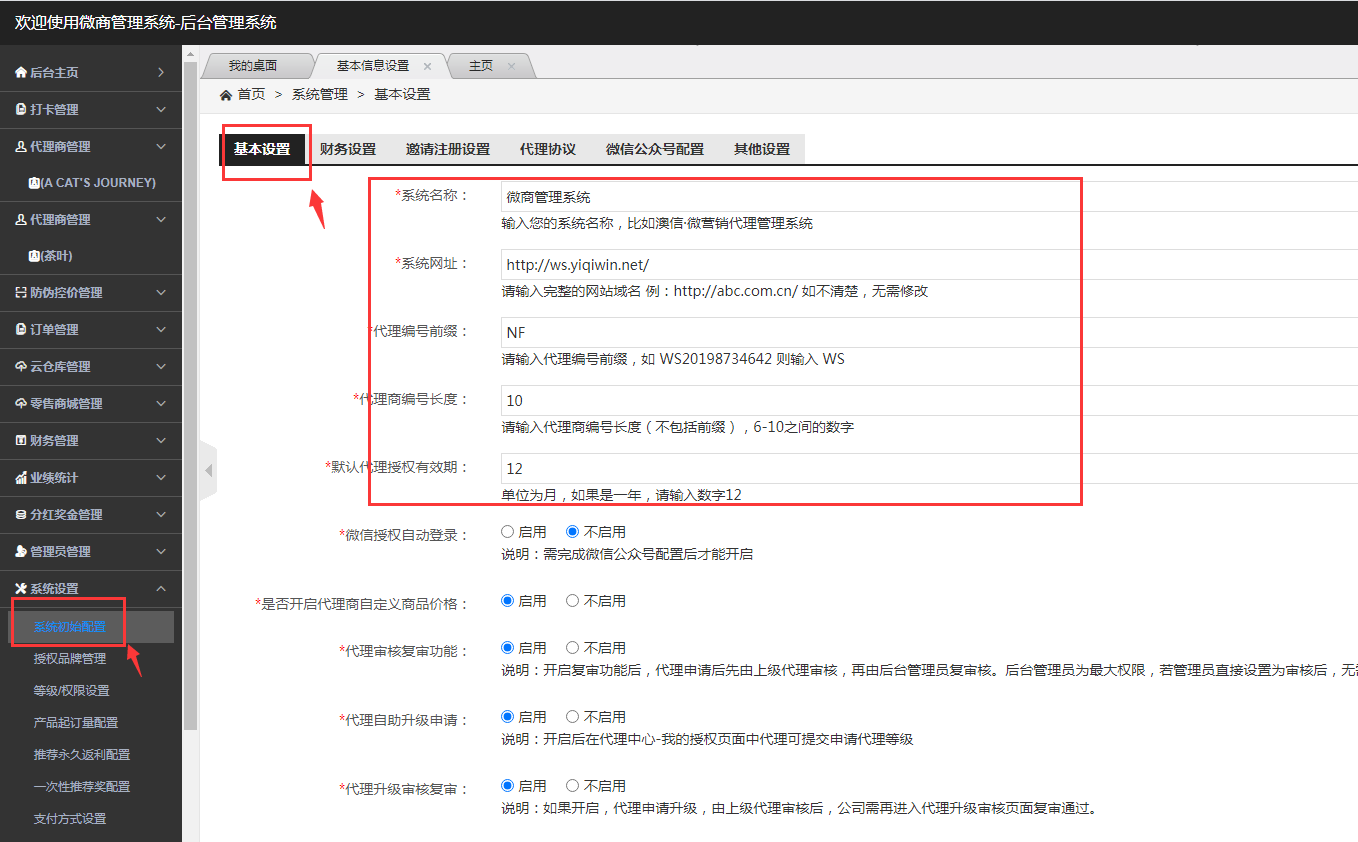 登录系统后台后,点击系统设置-系统初始配置-基本设置 根据您的业务设置相应的参数。一般初始参数客户经理在开通系统时会为您初始设置好,若有不明白的参考可参考高级设置教程说明或咨询您的客户经理。