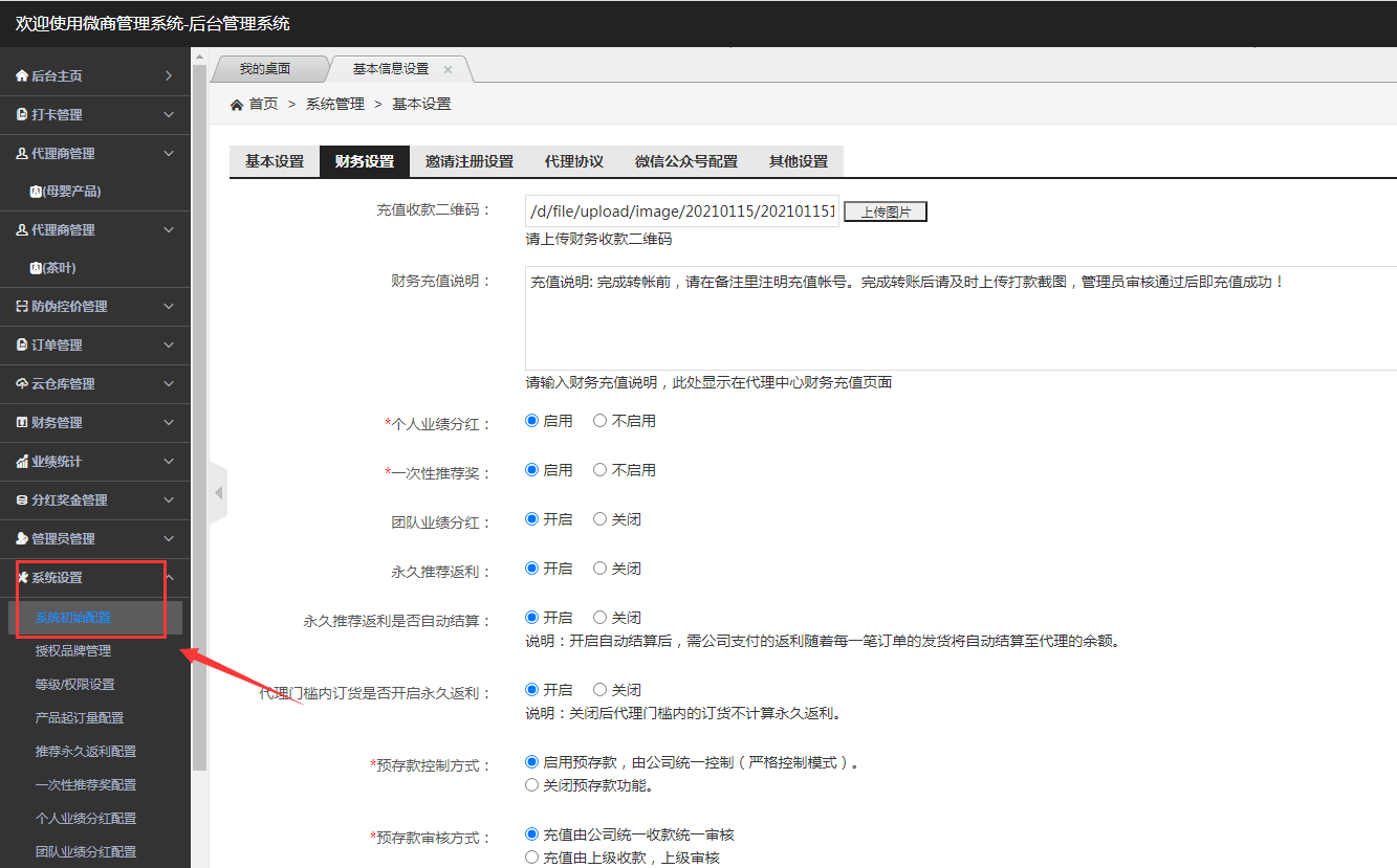 登录系统后台后,点击系统设置-系统初始配置-财务设置 根据您的业务设置相应的参数。在这里您可以设置您公司的收款信息、分红奖励方式、预存款控制方式、提现设置等。
