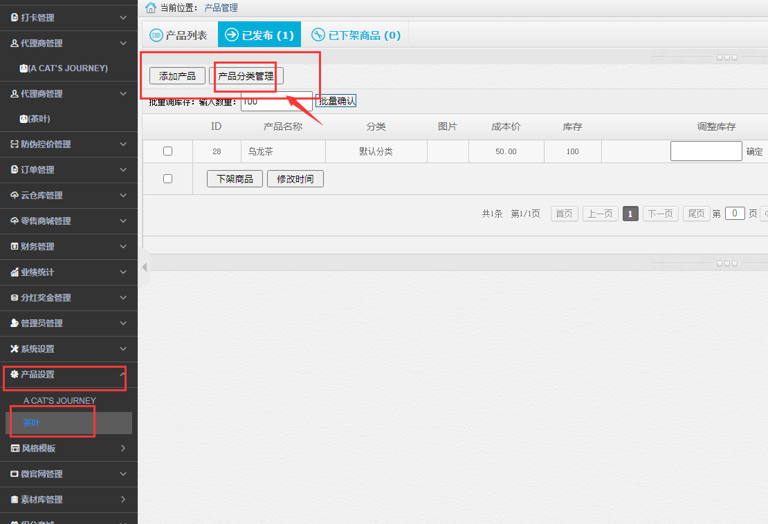 点击左侧【产品设置】,产品分类管理,添加您的产品分类。