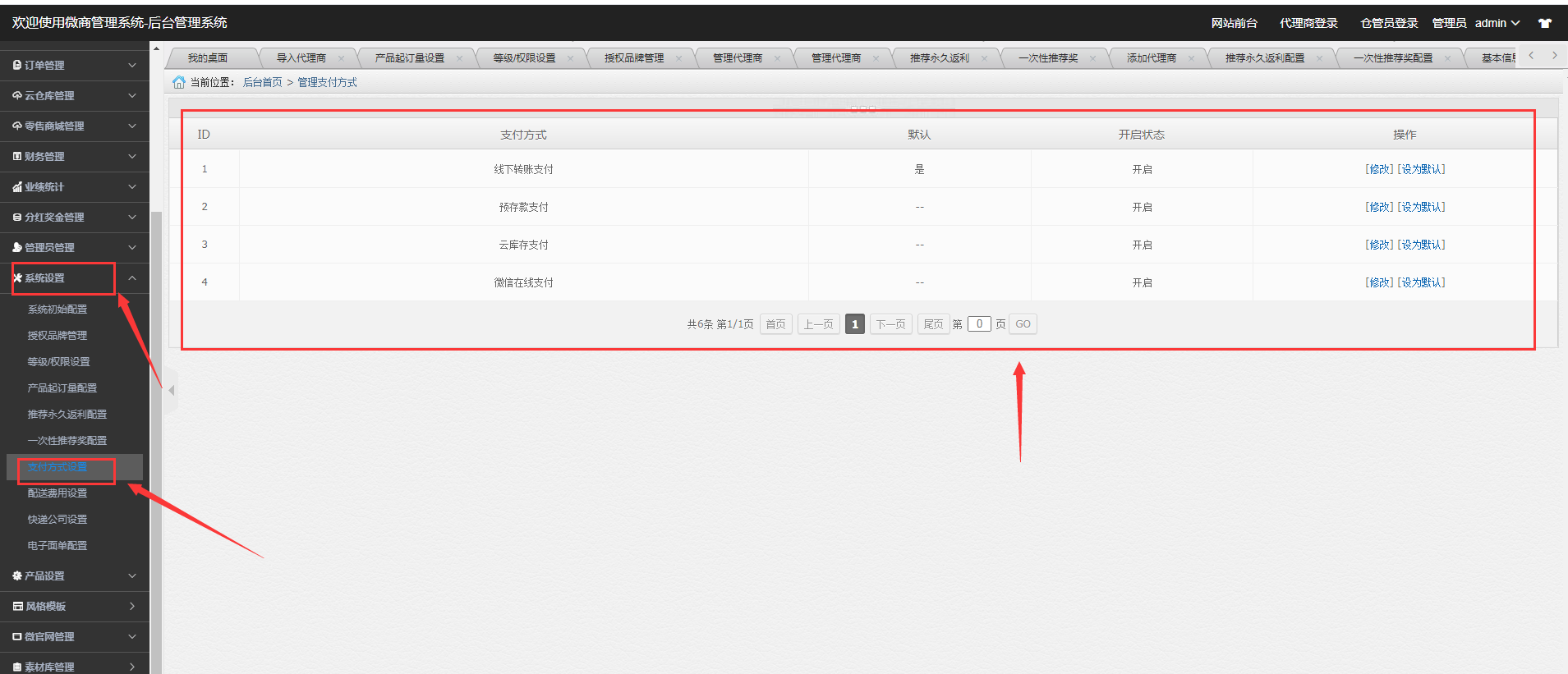 4种支付模式可以选择开启或关闭,至少开启一种支付模式,可以设置默认使用的支付模式。也可以对每种支付的名称和说明进行修改。