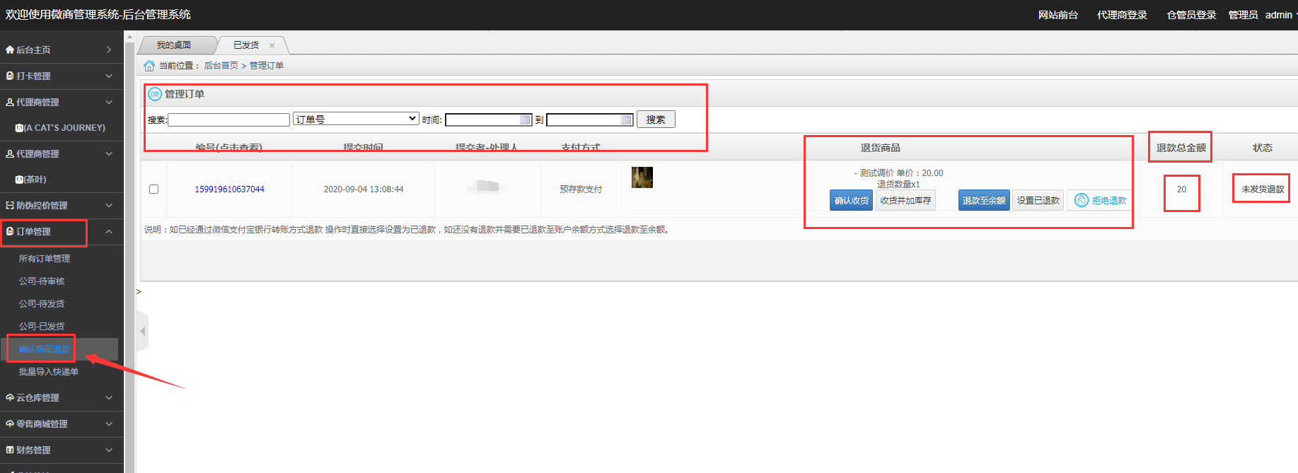 用户申请退款的订单会显示在 ‘订单管理-确认商品退款’中,可以看到所有申请退款的商品,可以对申请退款的订单进行确认收货并增加库存,退款到余额,拒绝退款等操作。