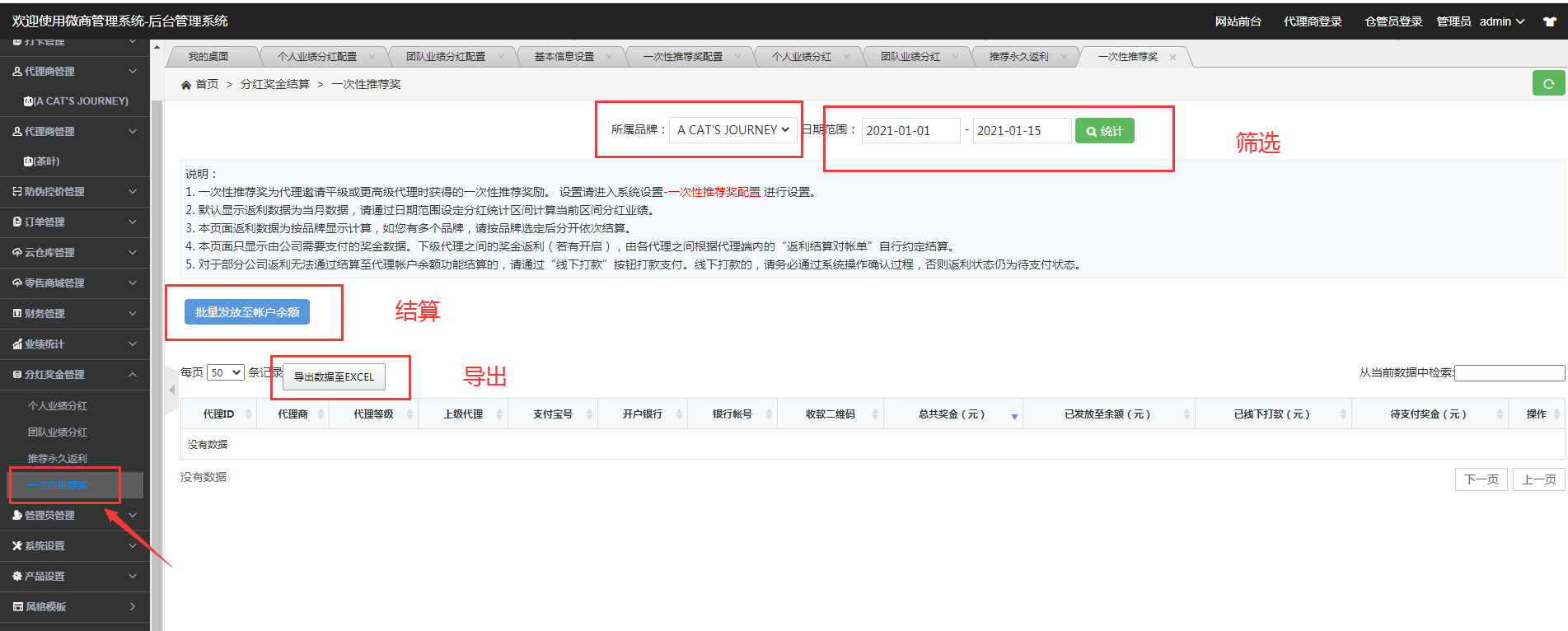 1\. 一次性推荐奖为代理邀请平级或更高级代理时获得的一次性推荐奖励。 设置请进入系统设置-[一次性推荐奖配置]进行设置。