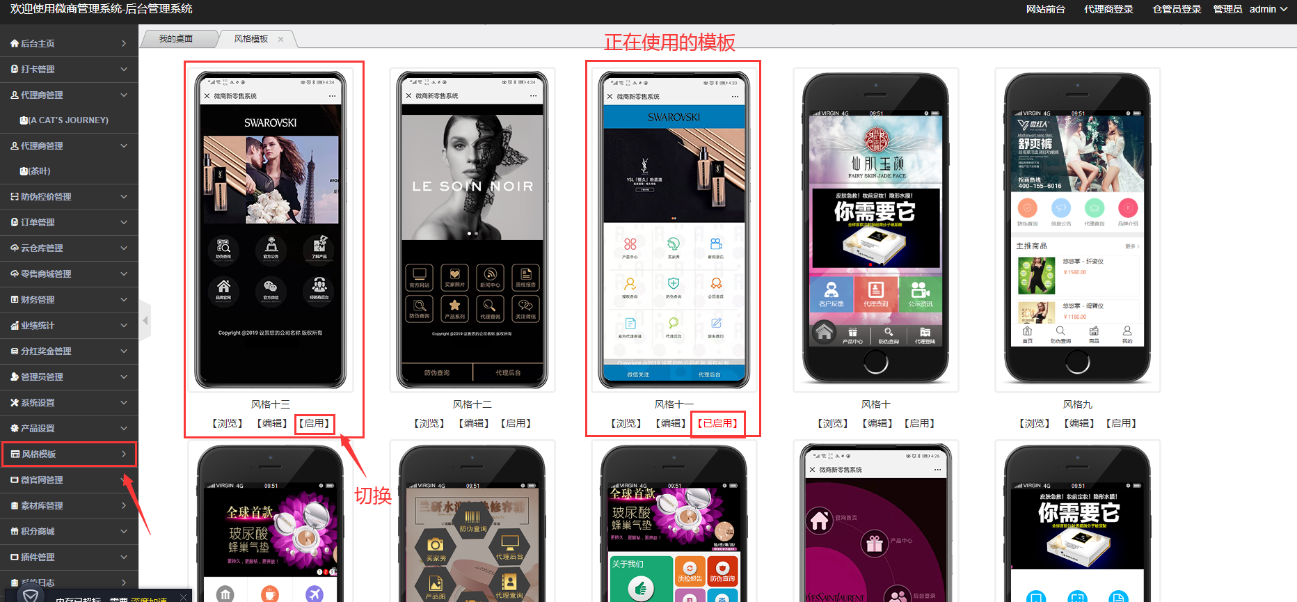 切换时直接点击模板下方“启用”按钮即可。