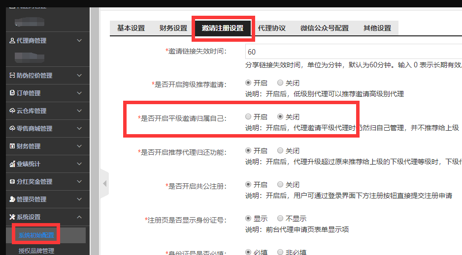 该功能默认为关闭状态。若开启后,代理邀请平级关系的代理时仍然归代理自己管理,不再推荐给上级。