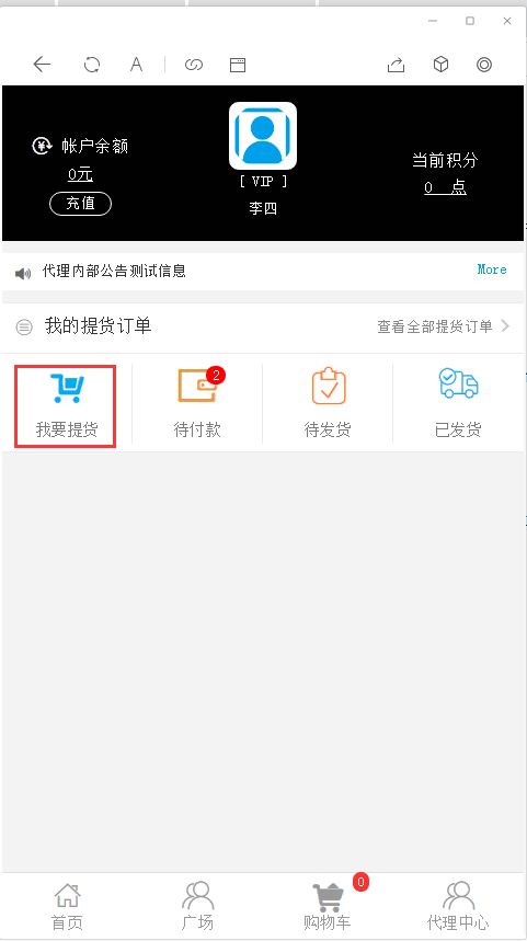 跳转到系统页面后,您可以进入账户页面完善收款/个人收件信息等操作。或者点击“我要提货”按钮进行下单。
