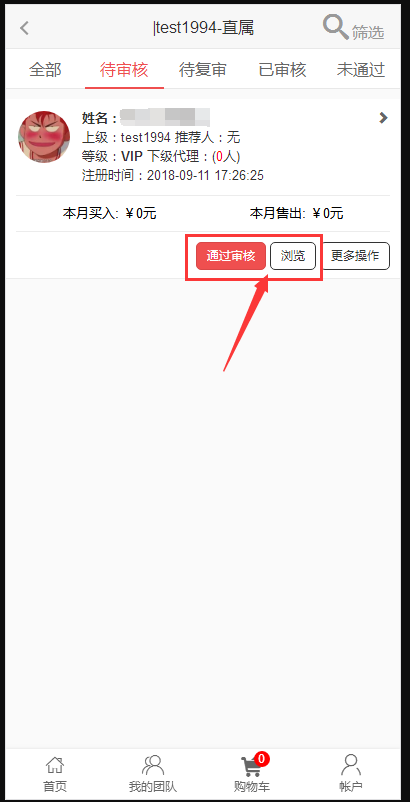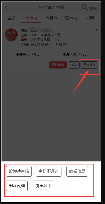 进入审核页面后,先点击“浏览”,确认代理信息以及打款截图(如果有)确认通过后,点击“通过审核”。如有不确认的信息,可以点击“更多操作”来进行处理