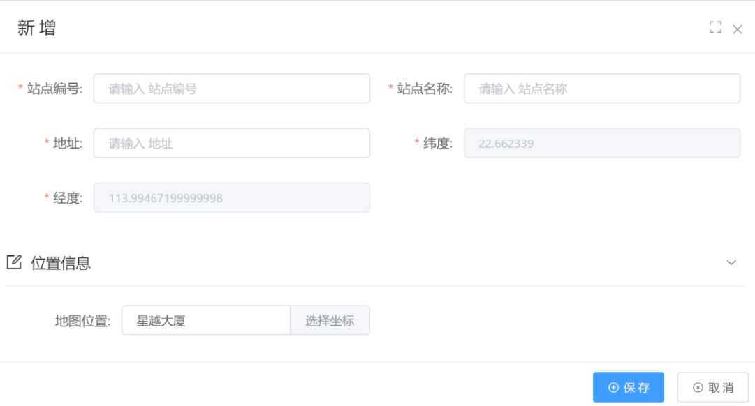 增加站点:填写站点编号、站点名称、站点地址、地址位置选择