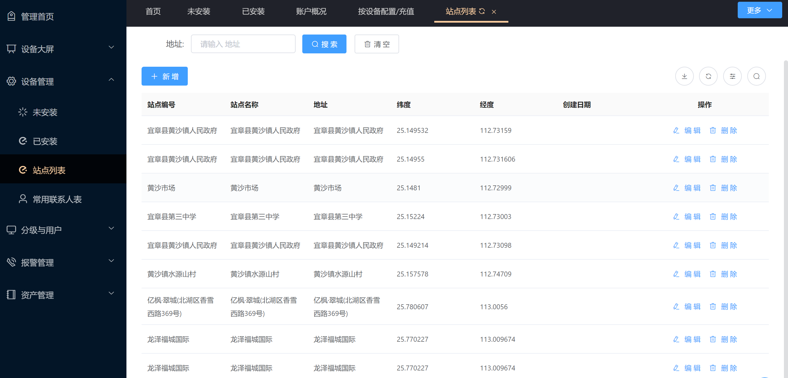 站点是安装的大区域如(一栋楼、某个街道等);列表信息显示:站点编号、站点名称、纬度,经度、站点地址、创建时间