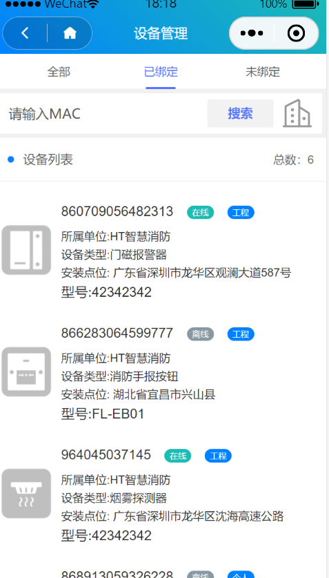 设备列表分为:已绑定、未绑定 两种状态列表,并支持设备添加,设备过户、设备搜索功能