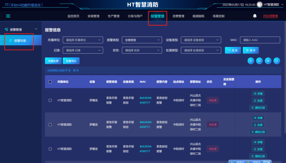 【报警管理】-【报警记录】看到所有的报警信息