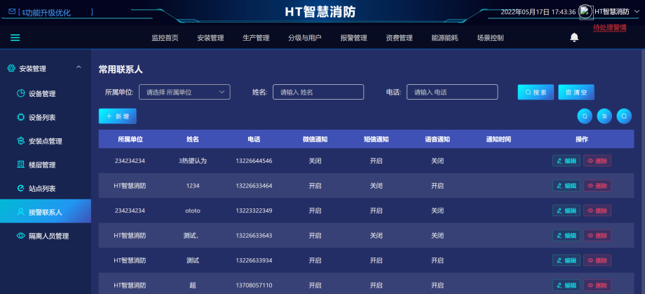 进入安装管理-接警联系人,点击新增联系人