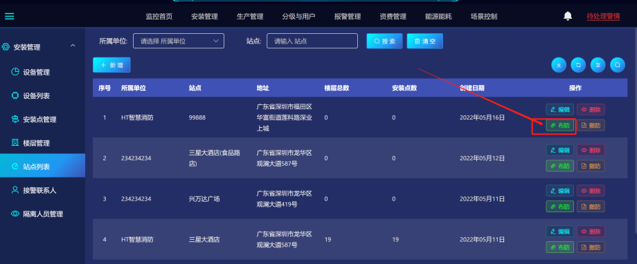 1、一键布防将对该站点下所有安装点进行布防,确认后将重置站点下所有安装点布防状态。