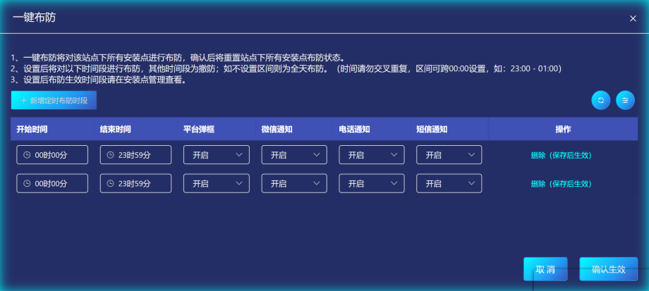 2、设置后将对以下时间段进行布防,其他时间段为撤防;如不设置区间则为全天布防。(时间请勿交叉重复,区间可跨00:00设置,如:23:00 - 01:00)