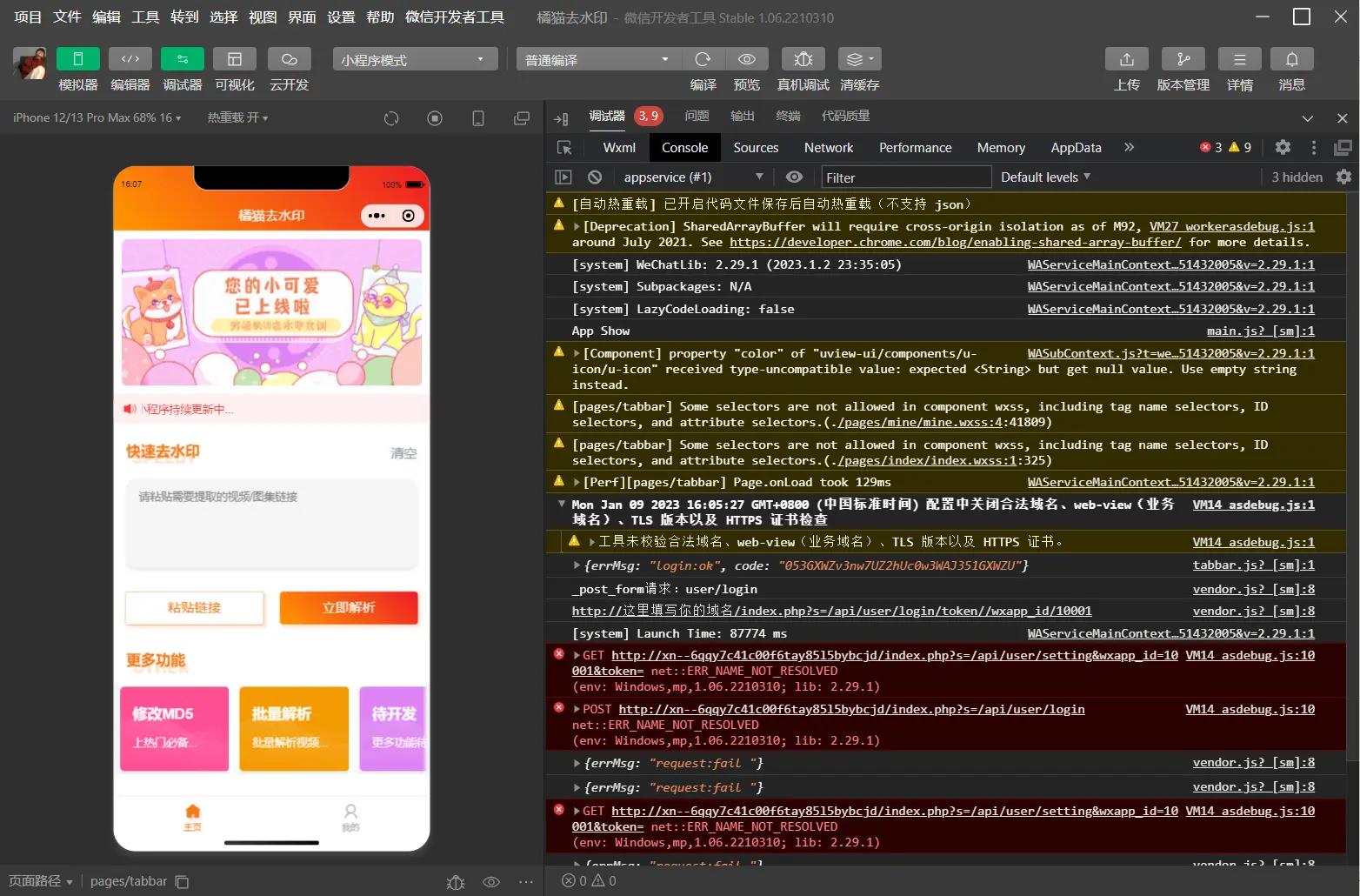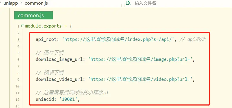打开文件commom.js,修改域名,以及管理端创建的小程序id