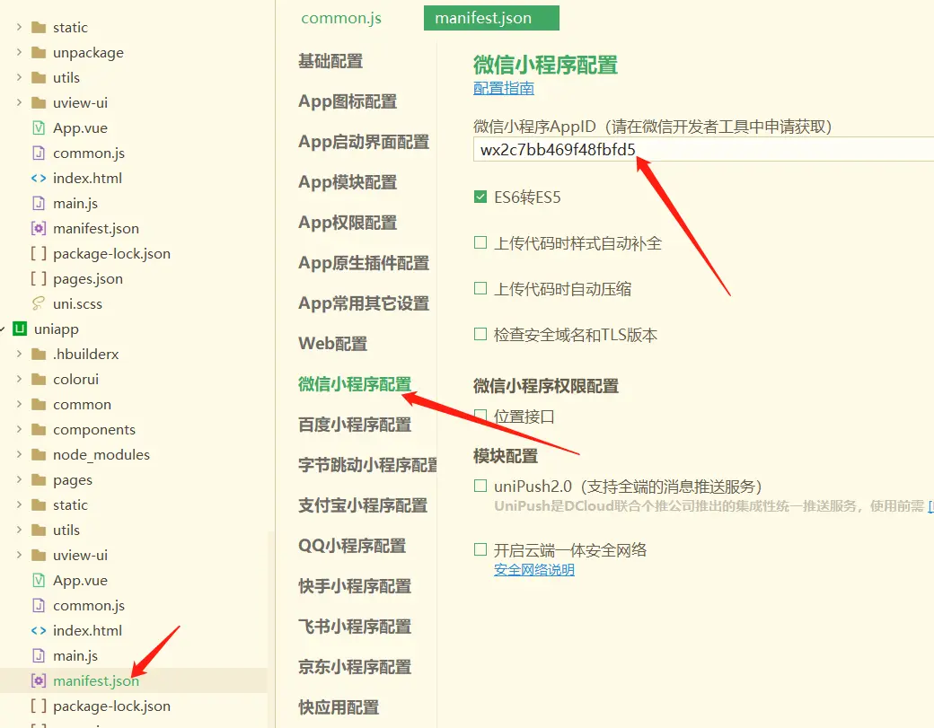 打开文件manifest.json,修改微信小程序AppId